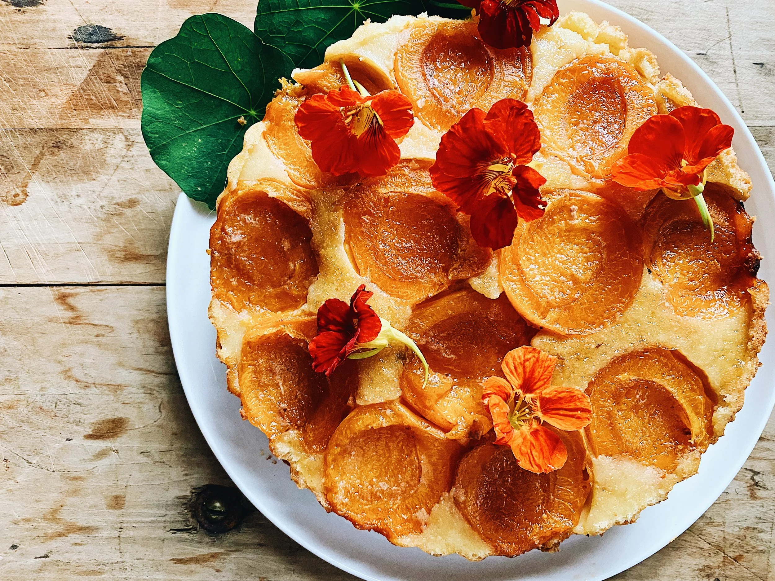 Spread over the apricots. Don’t be tempted to tap the pan, you want to keep the air bubbles in tact.