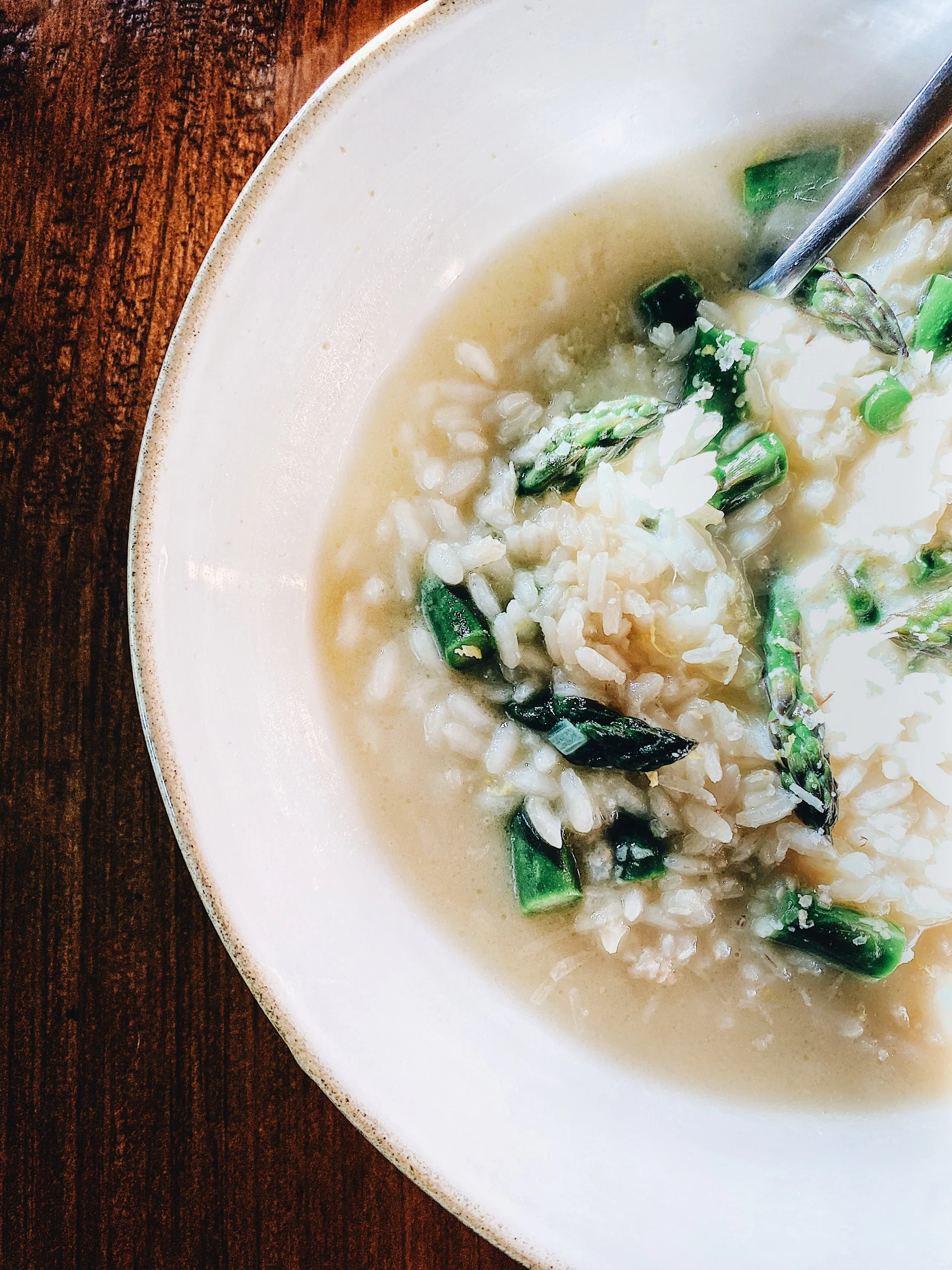 Once the rice is perfectly cooked and the liquid is still loose and silky, turn off the heat and add in the asparagus along with the remaining butter, parmigiano, lemon zest and the juice of half the lemon. Stir gently to combine. Serve immediately - in a bowl with a spoon. Garnish with more parmigiano and some more fresh lemon zest.