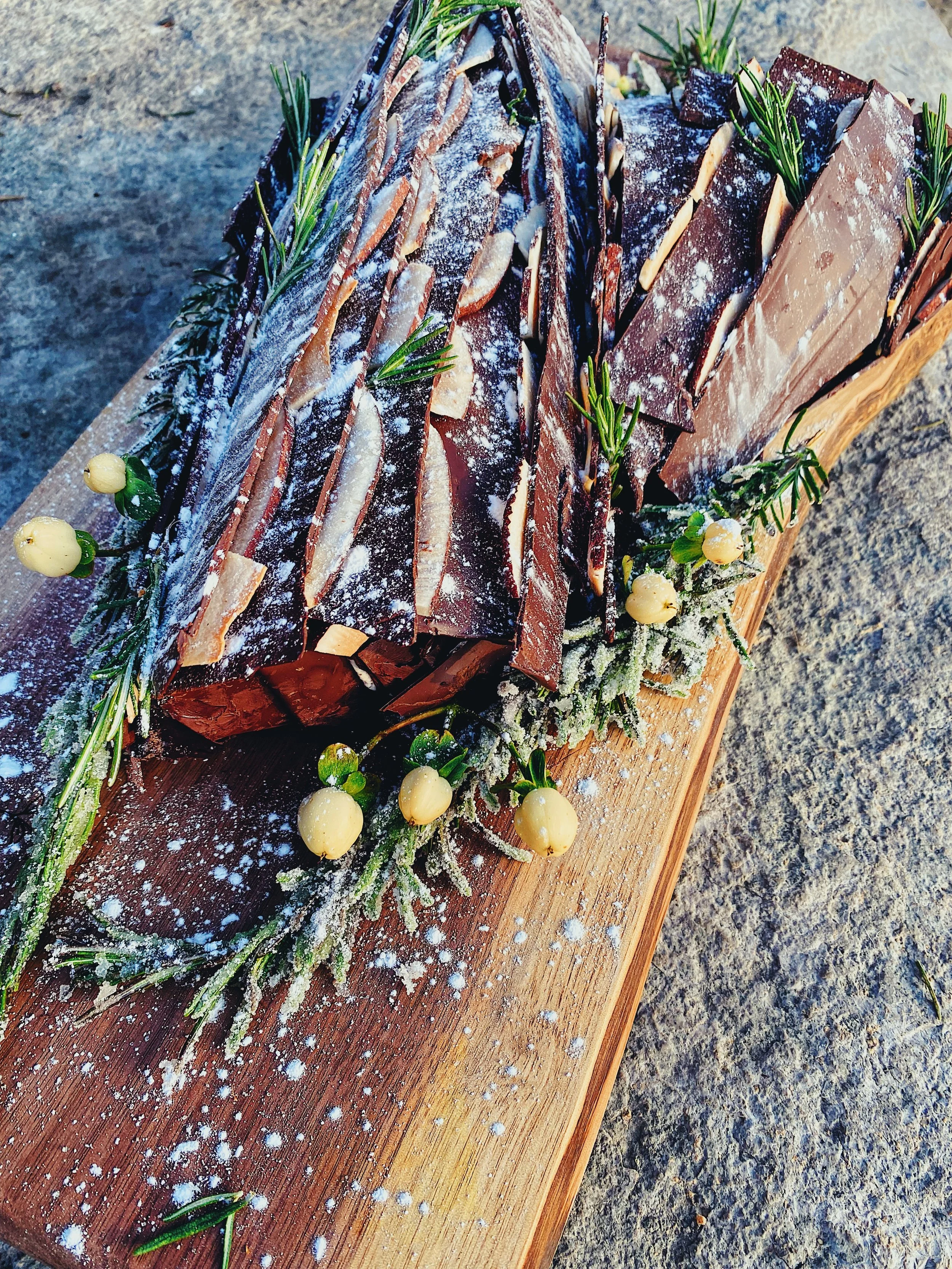 Use an offset spatula to spread the ganache on top and on the sides. You can simply create “bark” by using fork tines to drag lines through the soft ganache. Or, melt some chocolate and spread out on a lined sheet pan - allow to set. Crack the set chocolate into long shards and stick them to the ganache to create shaggy bark.