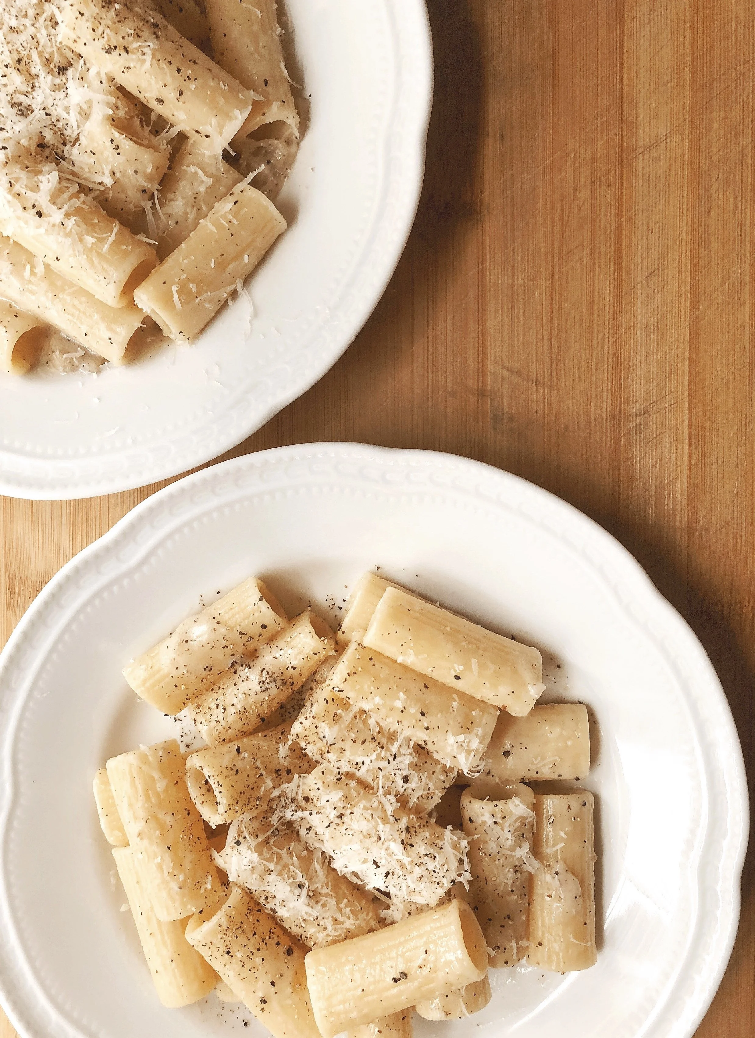 PLACE THE HOt PASTA IN THE BOWL WITH THE CHEESE, ADDING A FEW SPLASHES OF THE COOKING LIQUID. STIR QUICKLY TO EMULSIFY THE SAUCE AND COAT EACH piece OF PASTA.