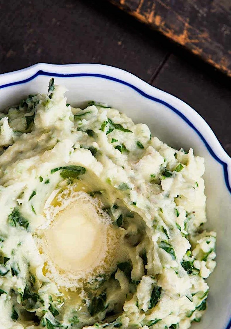 In a large pot of boiling water cook the potatoes until tender. Once cooked, drain and return to the pot to steam under a lid. At the same time, in a separate pot of boiling salted water, cook the cabbage and kale for 4-6 minutes until just tender. Drain and set aside.