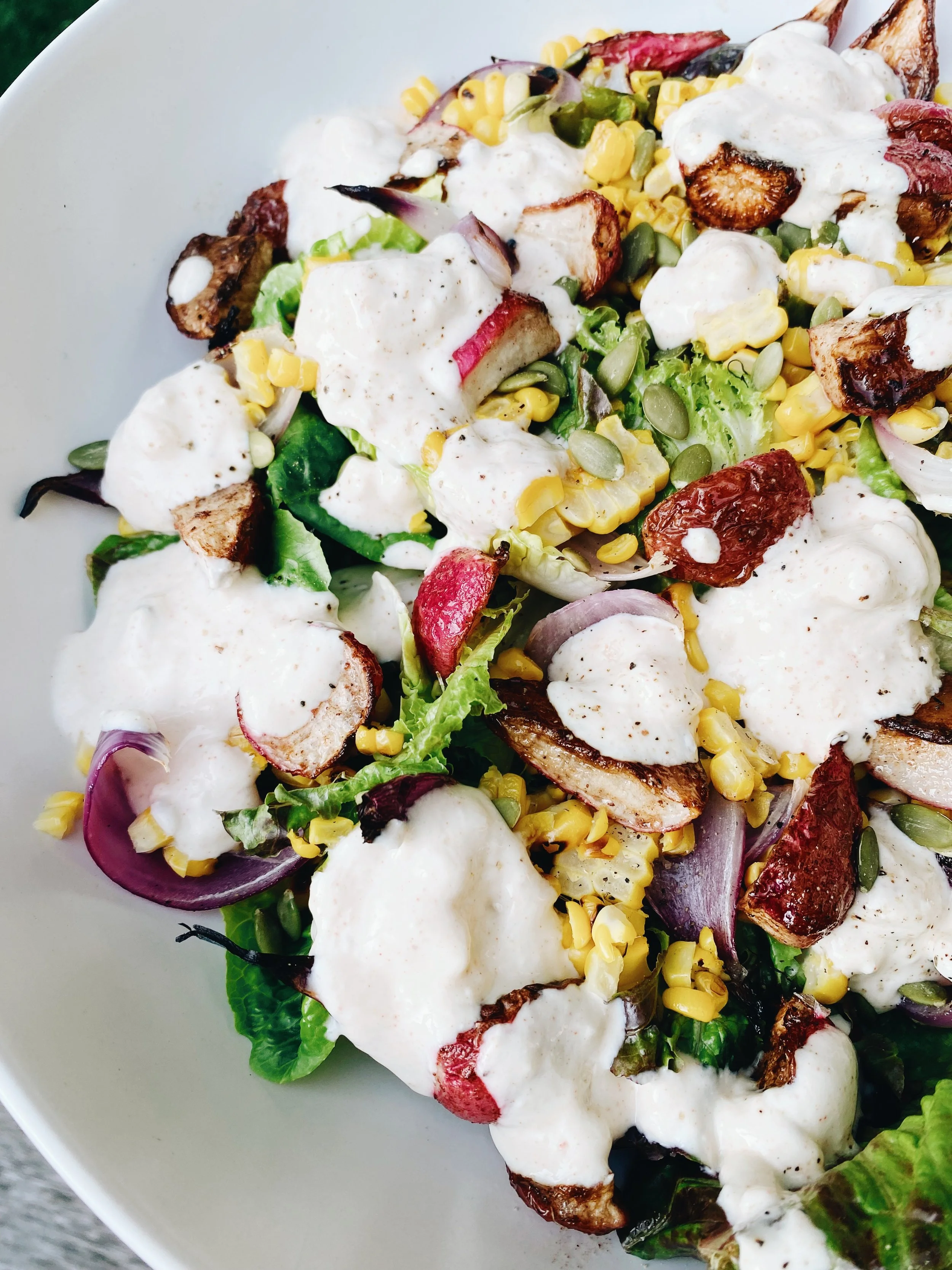 Assemble your salad by arranging the lettuce leaves on the bottom. Top with the slivers of grilled onion. Chop the jalapeño into smaller pieces and remove the corn kernels from the cob with a sharp knife. Add the radishes, pumpkin seeds and spoon over the dressing. Season with a sprinkle of flakey salt to finish.