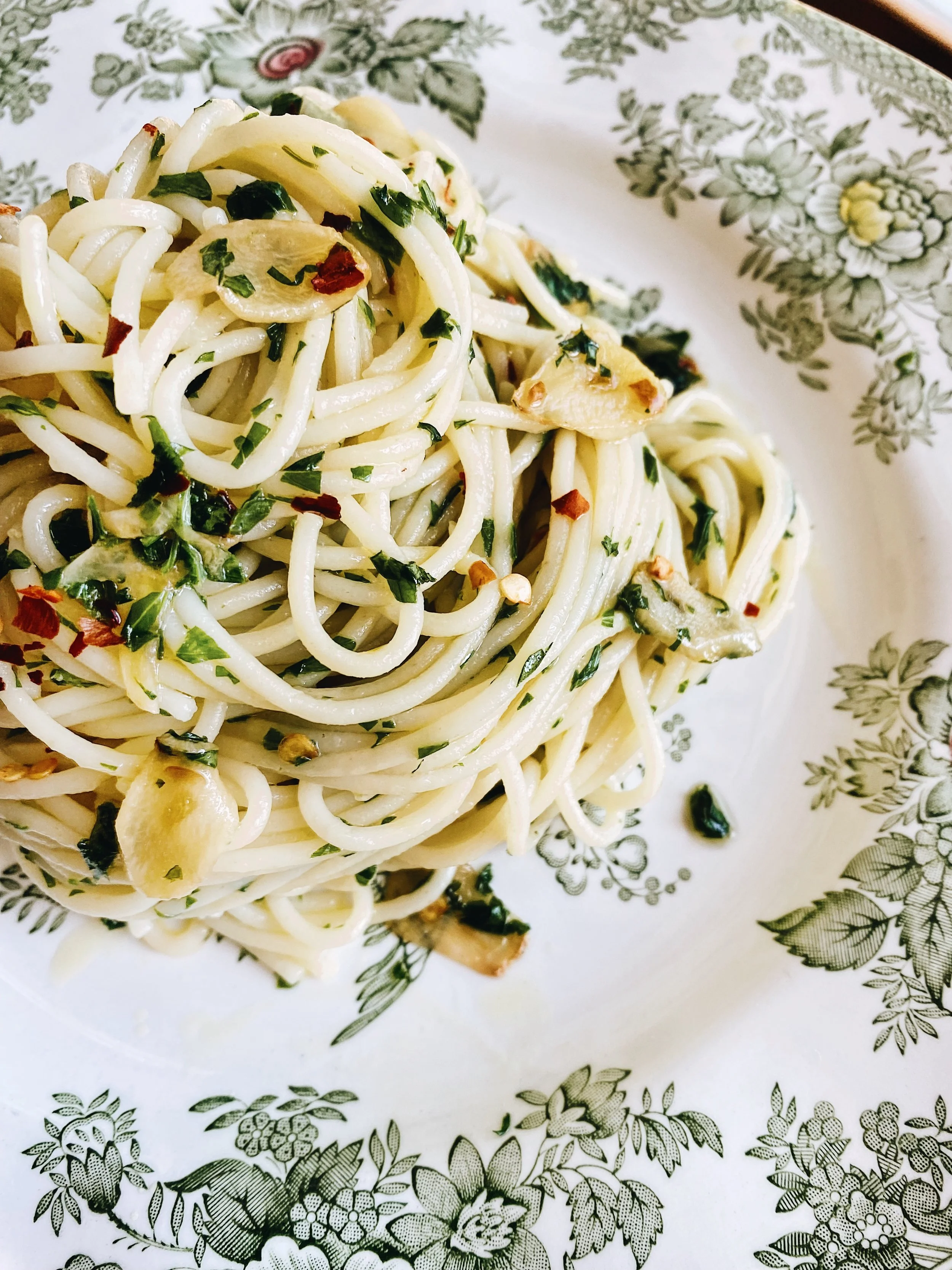 Meanwhile over medium low flame, heat the oil with the slices of garlic and peperoncino - being very careful to watch this process to ensure the garlic does not brown or burn. Cook for 2-3 minutes until the garlic is soft. Remove from heat. Add the parsley. Drag the cooked pasta directly from the hot water (allowing most of the water to drain off) to the oil. Toss quickly and serve immediately. Finish with some flakey salt or a spritz of fresh lemon and some extra virgin olive oil. Traditionally not served with grated cheese on top - but add some if desired!