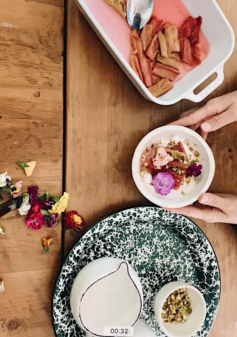 In small serving bowls divide the yogurt. Top with the rhubarb and some of the juices. Sprinkle with chopped pistachios and drizzle with honey if desired.