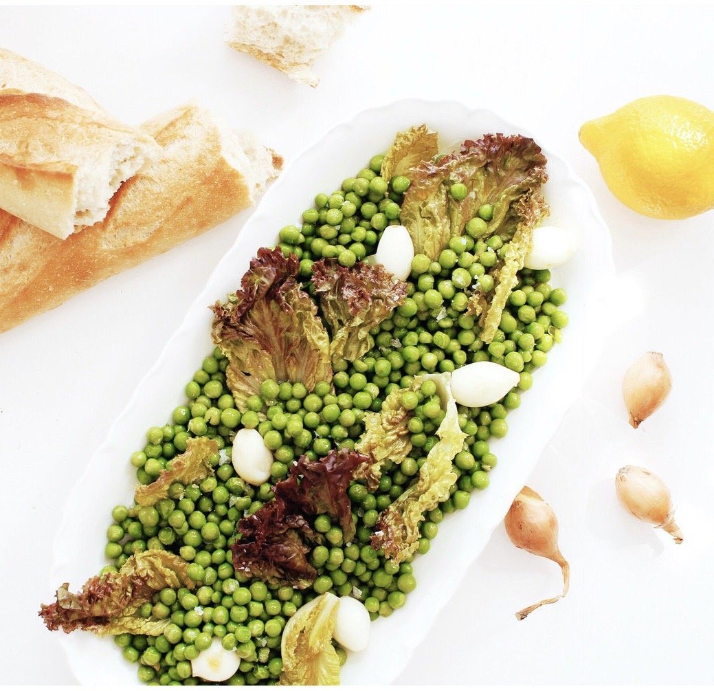 In a large saute pan heat the oil and butter together over medium heat until the butter is just starting to foam. Toss in pearl onions and shake around to coat them in the fat. cook for about 5 minutes until the outer layer softens. Toss in the peas and saute for another 8-10 minutes. Meanwhile, prep lettuce by gently pulling the leaves apart.