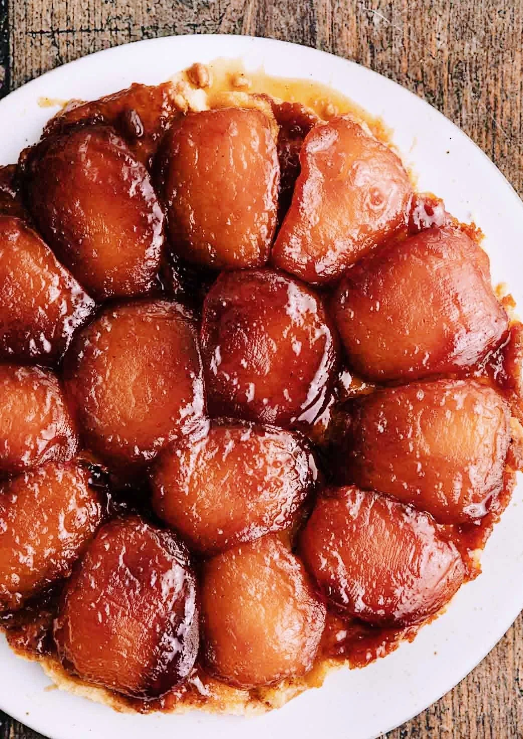 THE TARTE SHOULD STILL MOVE WHEN YOU JIGGLE THE SKILLET. CAREFULLY INVERT A PLATE OVER THE SKILLET THEN QUICKLY FLIP OVER SO THE APPLES ARE NOW FACE UP ON THE PLATE