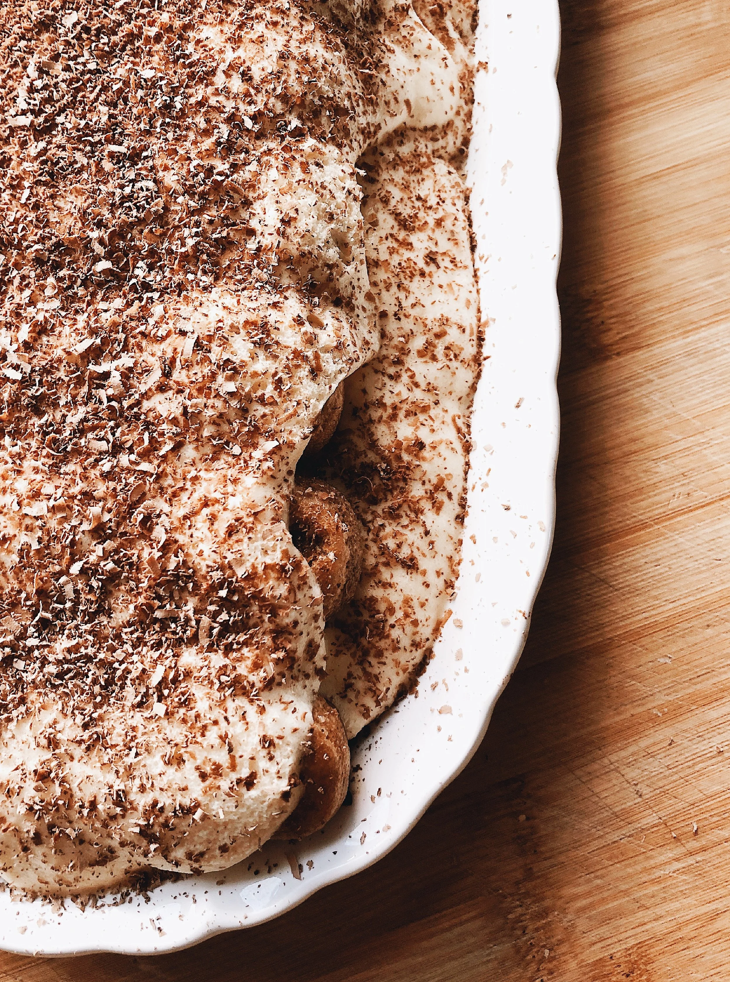 Quickly dip and turn each savoiardi in the espresso, just enough to kiss the outer layer. Continue with more savoiardi until you have your base layer. Spoon over half of the mascarpone and gently spread evenly. Top with a generous shaving of dark chocolate (use a grater or microplane). Do the exact same steps with the remaining savoiardi and mascarpone. Finish with a final healthy grating of dark chocolate.